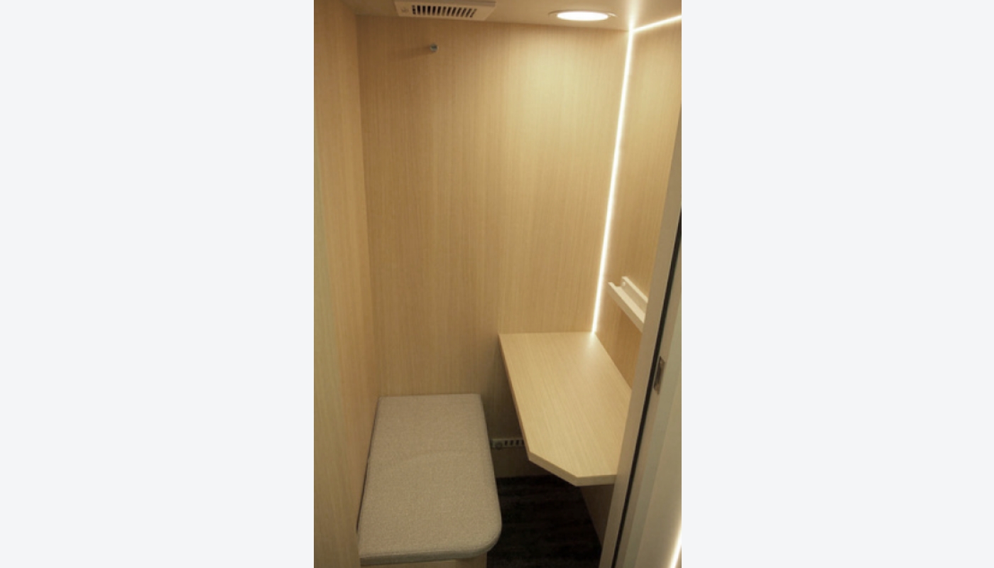 標準的なブースが幅120cm前後であるのに対し、CHATBOX は91cm と省スペース。高さも220cm未満に抑えつつ、消防法の要件や機能性、居住性を確保しています。