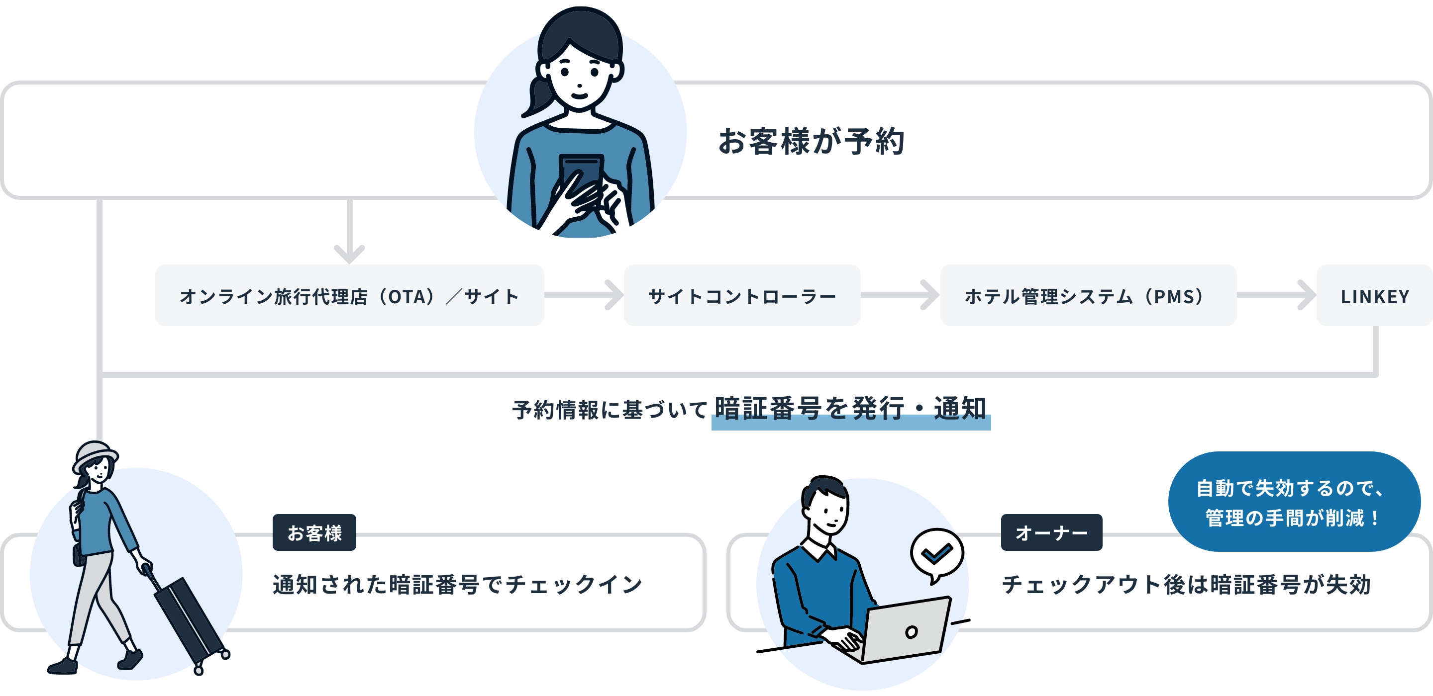 - 暗証番号を事前に通知するだけでスムーズなセルフチェックイン