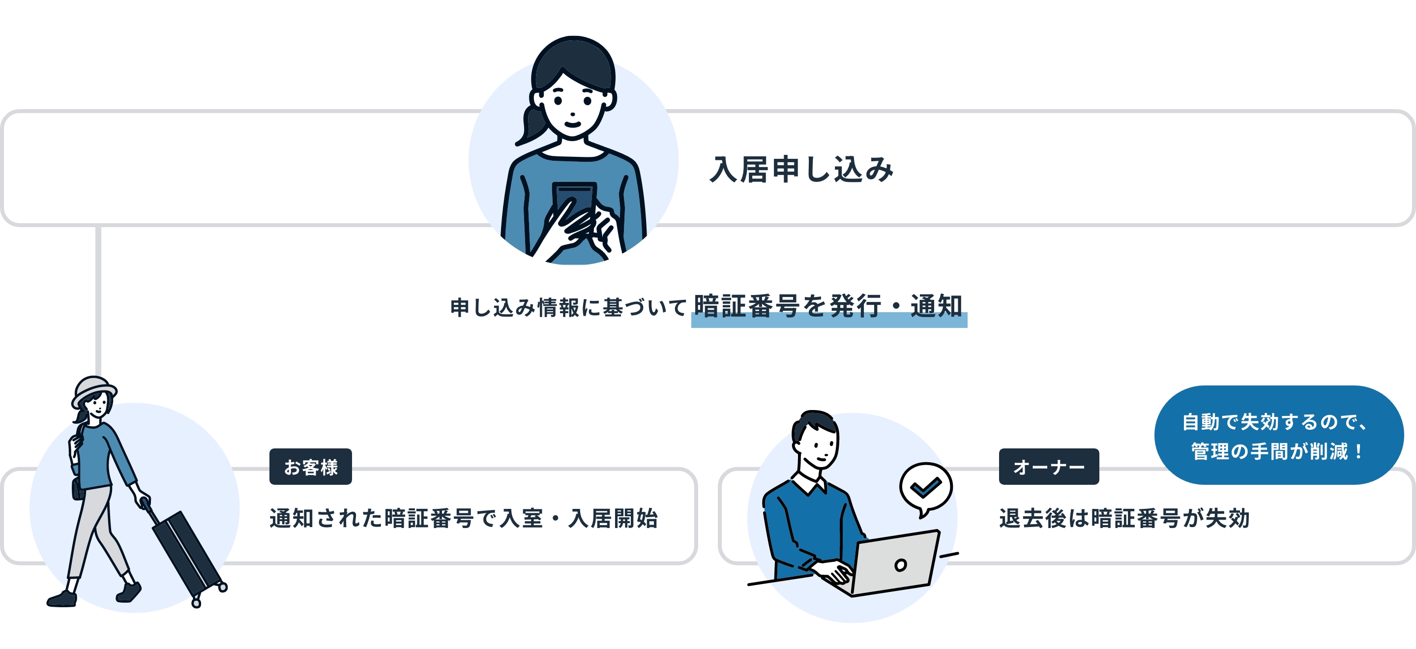 - 利用期間終了と同時に番号が無効化。鍵の回収不要で、次の入居者へすぐに切り替え可能。